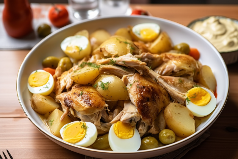 Il pollo, con la sua carne bianca e morbida e il suo sapore delicato, è un’ottima base per creare tante insalate diverse. In questa ricetta, lo combiniamo con le uova sode e le patate, ma può essere abbinato anche ai peperoni e ai capperi per un’insalata agrodolce o alla lattuga e al sedano per una versione più fresca. Anche le cipolle e le olive si sposano bene con il pollo, creando un’insalata estiva davvero gustosa e leggera. Un’altra opzione deliziosa è l’insalata di pollo con maionese allo yogurt e fagiolini.